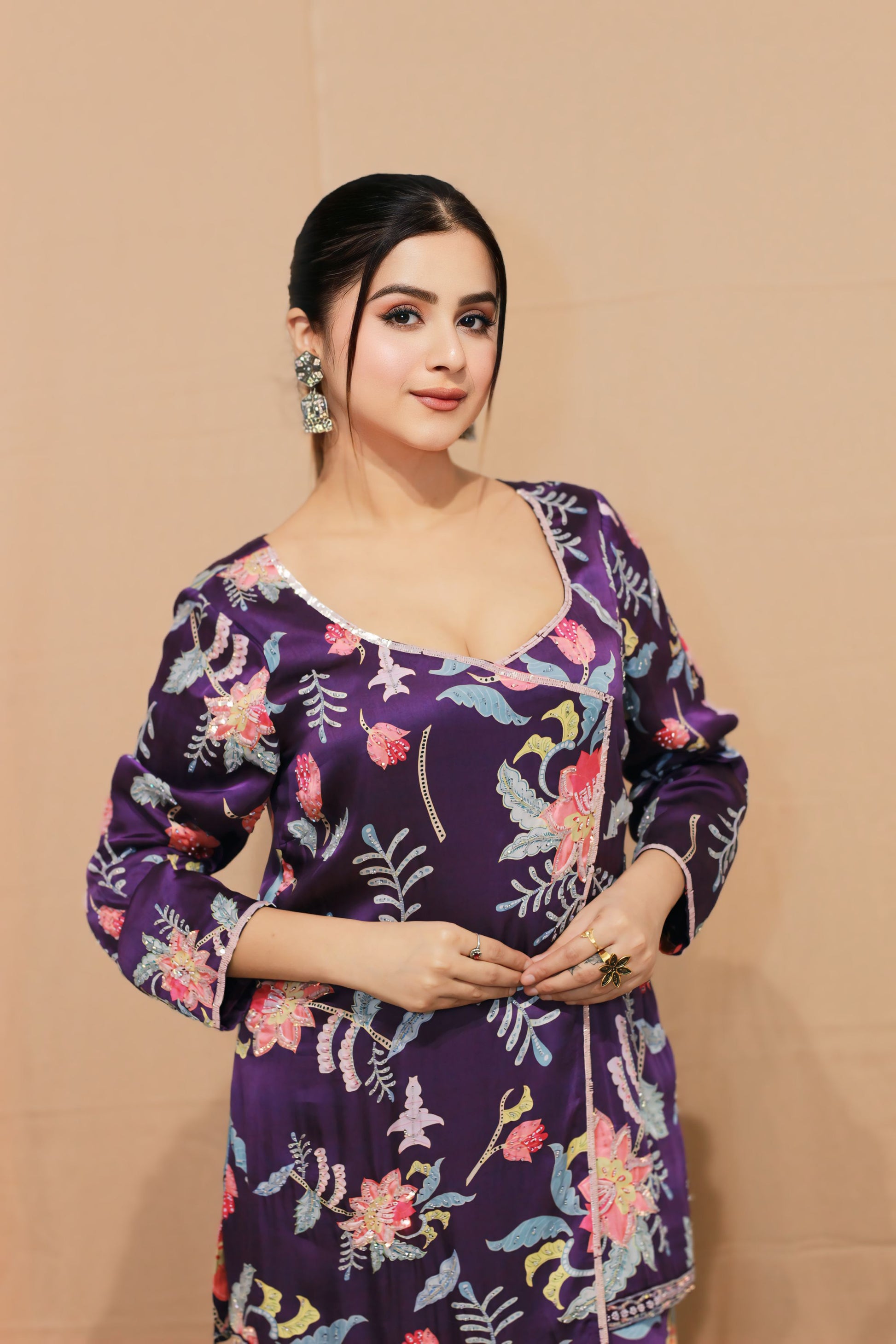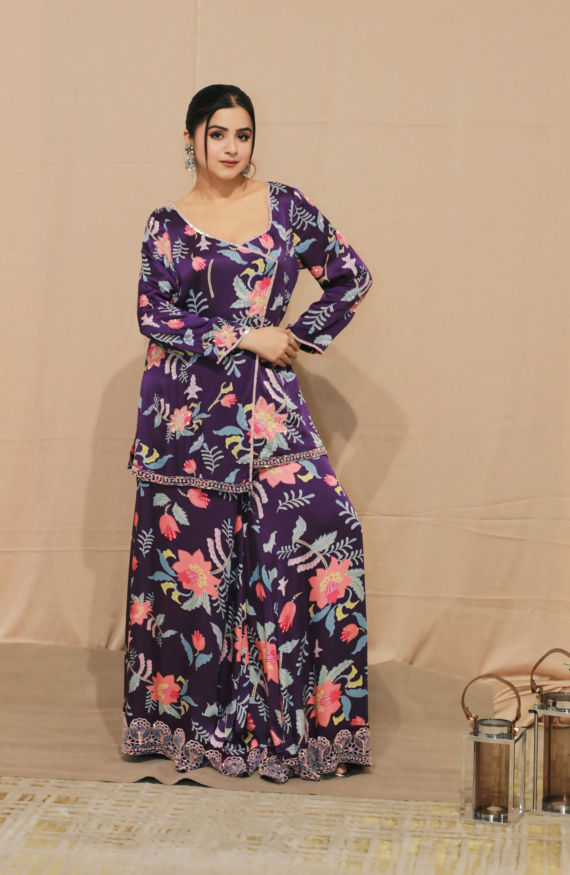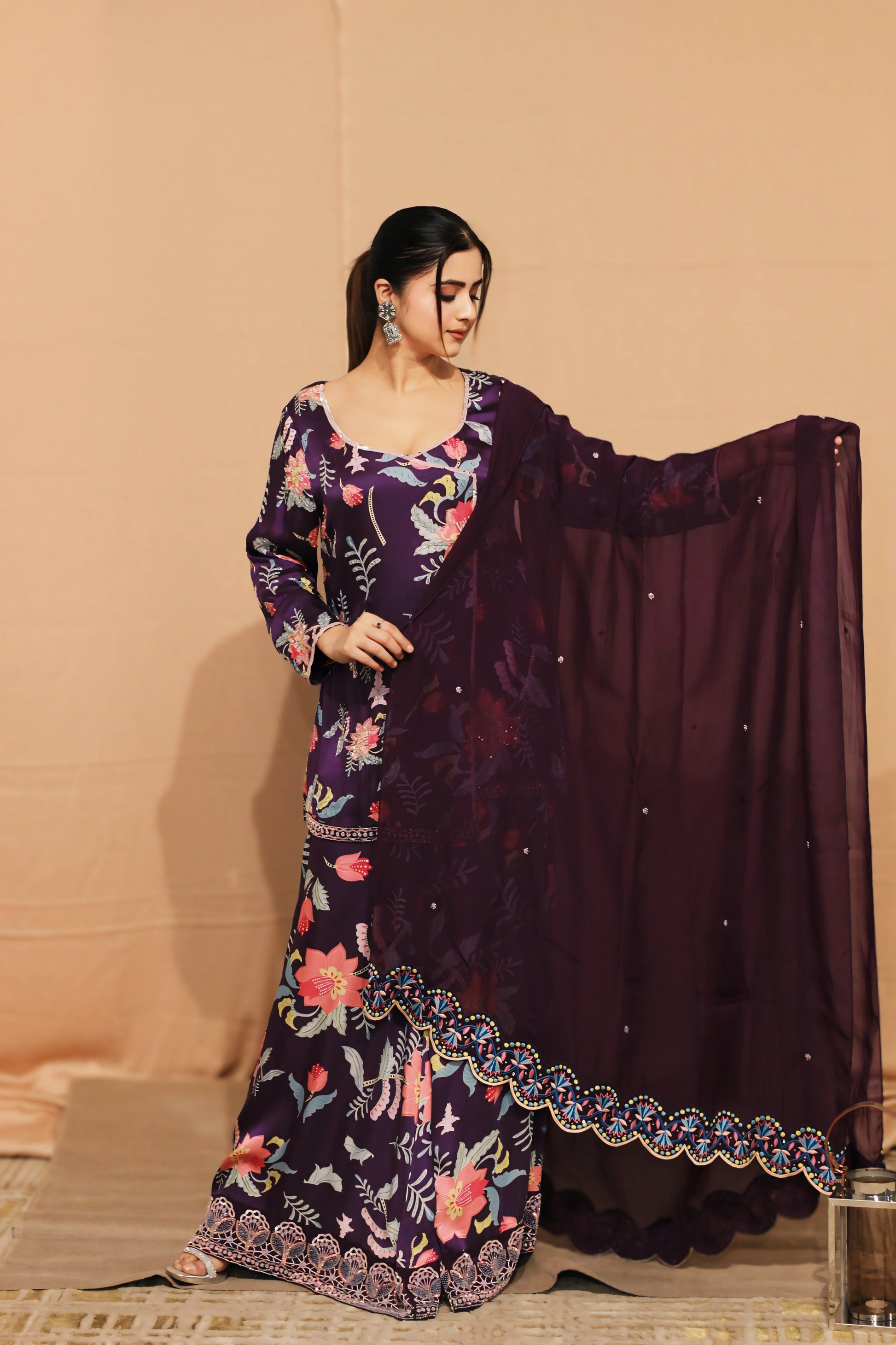 The Digital Printed Purple Modal Satin Sharara Set with Organza Embroidered Dupatta and Modal Satin Fabric Hand Embroidery featuring Moti, Cut Dana, and Sequence is a luxurious and contemporary ensemble, ideal for festive occasions or weddings.