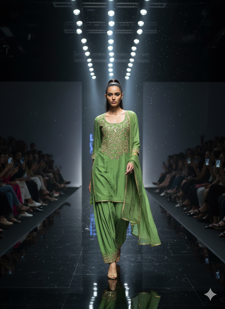 This stunning Green Chanderi Silk Straight Suit shines with exquisite handcrafted mirror embroidery, perfectly complemented by a matching Salwar and Organza Dupatta adorned with intricate mirror work.